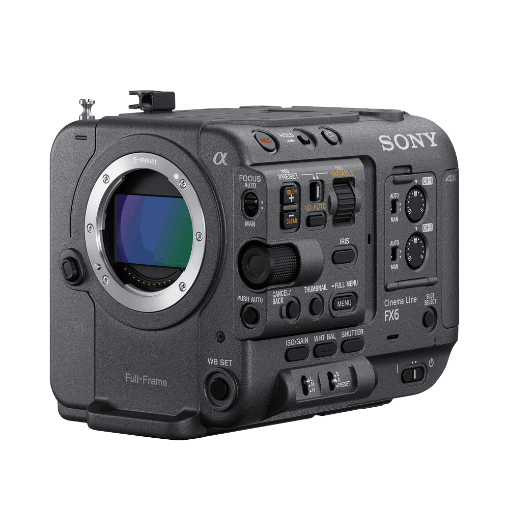 The Sony FX6 Full-Frame Cinema Camera puts revolutionary compactness and performance in the hands of creators, with its full-frame image sensor and breathtaking sensitivity. Leading-edge movie functions deliver game-changing performance and a library of cinematic looks, alongside pro interfaces and an electronic Variable ND Filter.